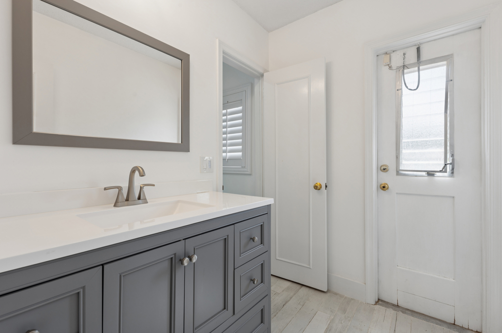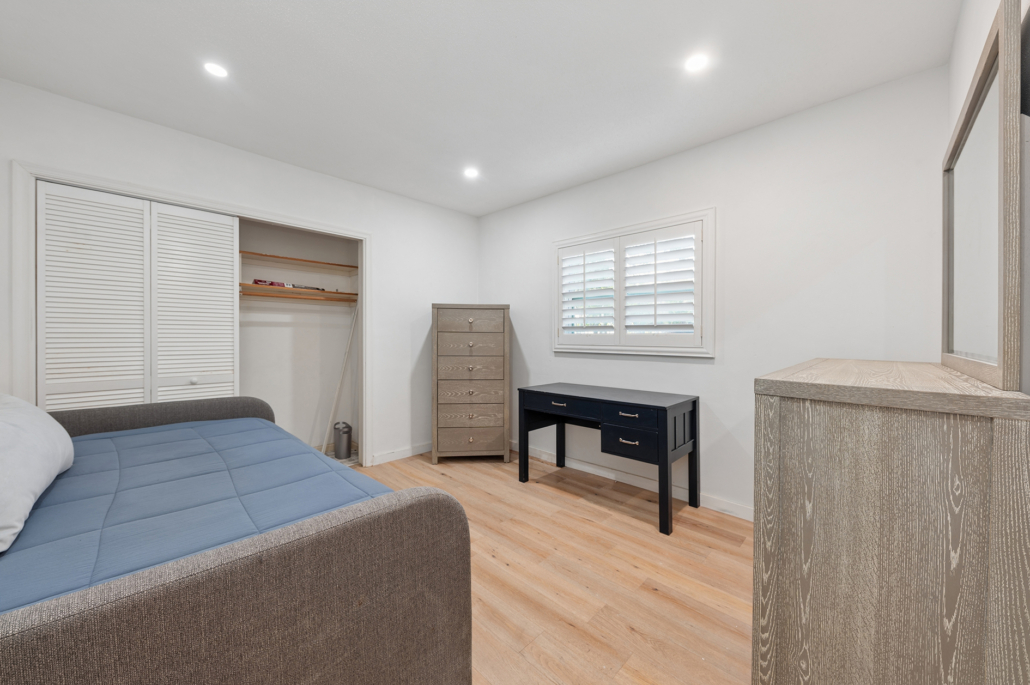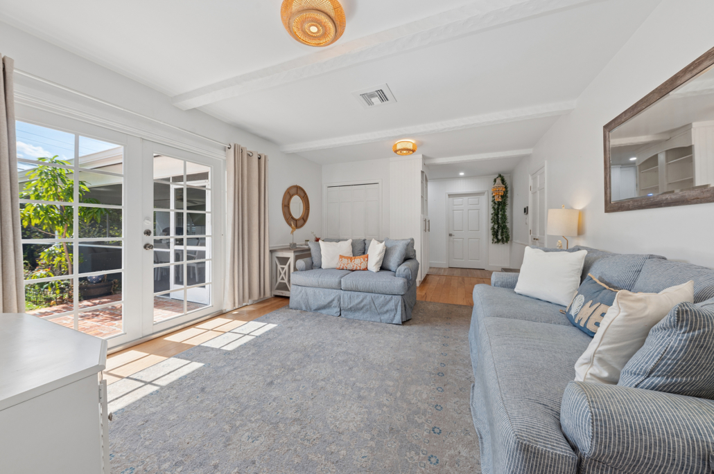 The bedroom layout further enhances the home’s versatility. The primary suite is privately positioned at the front of the home, creating a peaceful retreat. Bedrooms two and three occupy their own wing off the family room and share a renovated bath. A separate hallway door leads to a private guest or in-law wing featuring a fourth bedroom and a renovated cabana bath, ideal for visitors or multigenerational living.
