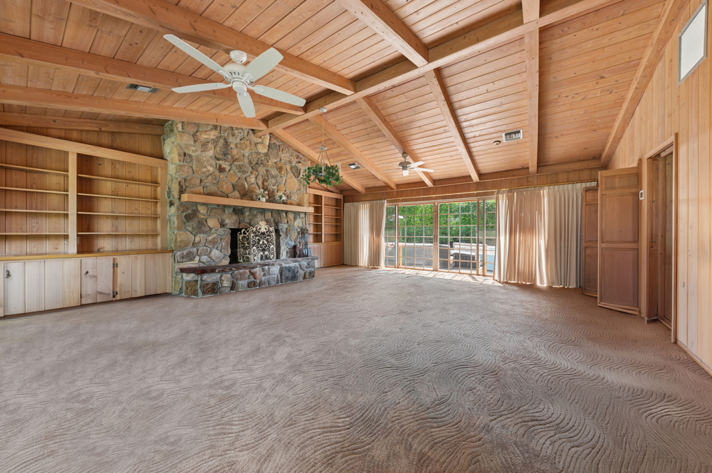 A standout feature of the home is the expansive bonus great room at the rear, rich with architectural character. Vaulted wood-beam ceilings and a dramatic floor-to-ceiling stone fireplace anchor the space, complemented by built-in shelving, cabinetry, and a built-in bar area that elevates its entertaining potential. A wall of sliding glass doors opens fully to the Chicago brick patio, creating a seamless indoor-outdoor experience. With its generous proportions and new lighting, this retreat offers incredible flexibility as a media room, lounge, game room, creative studio, or future reimagined space.