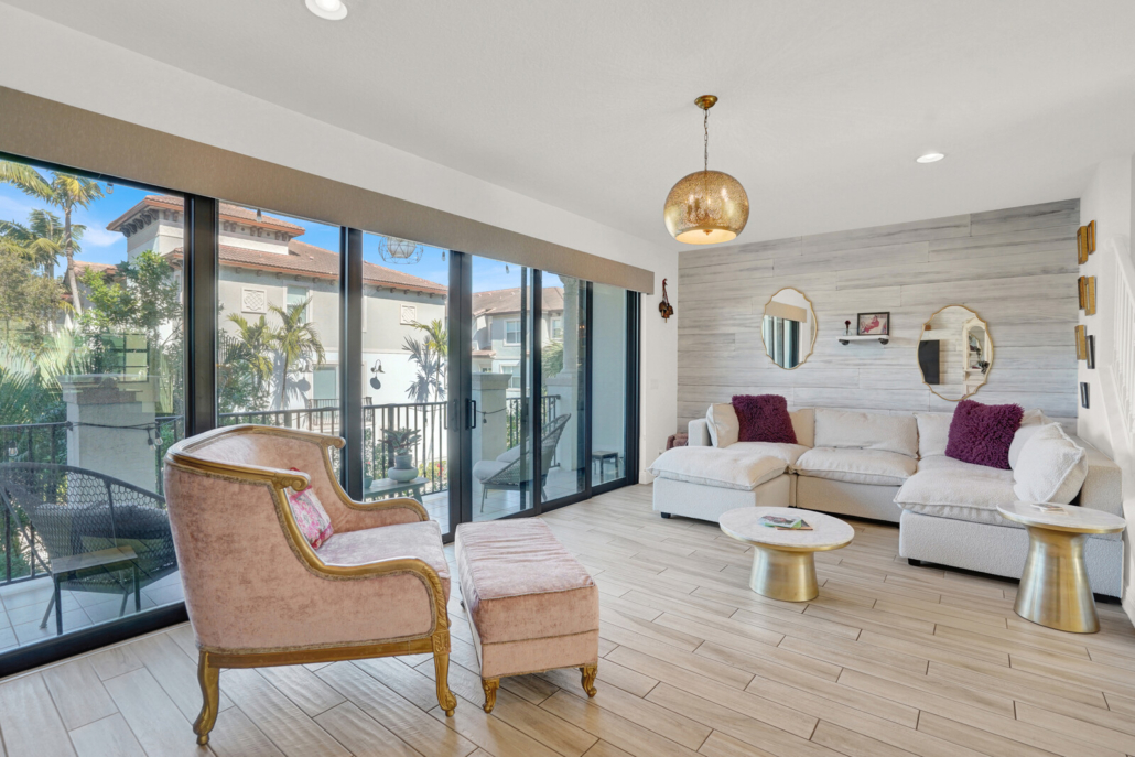 Upstairs, the main living area unfolds in a bright, open-concept layout highlighted by soaring ceilings and refined finishes. A dramatic wall of windows fills the space with natural light and opens to a private, oversized balcony, ideal for morning coffee, evening cocktails, alfresco dining, or simply enjoying the breeze coming off the intracoastal waterway. This seamless indoor–outdoor connection expands the living space and creates a warm, welcoming setting perfect for both entertaining and everyday relaxation.