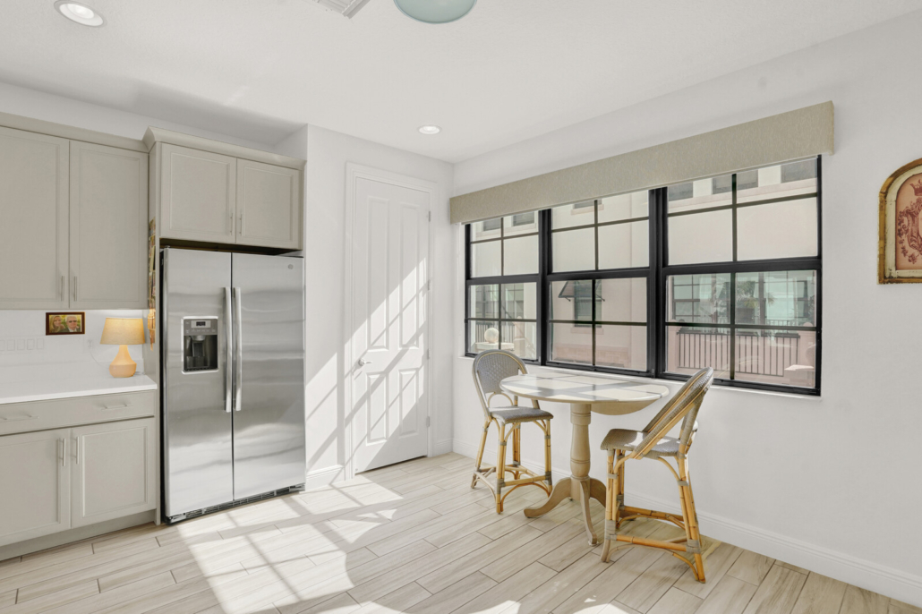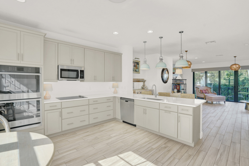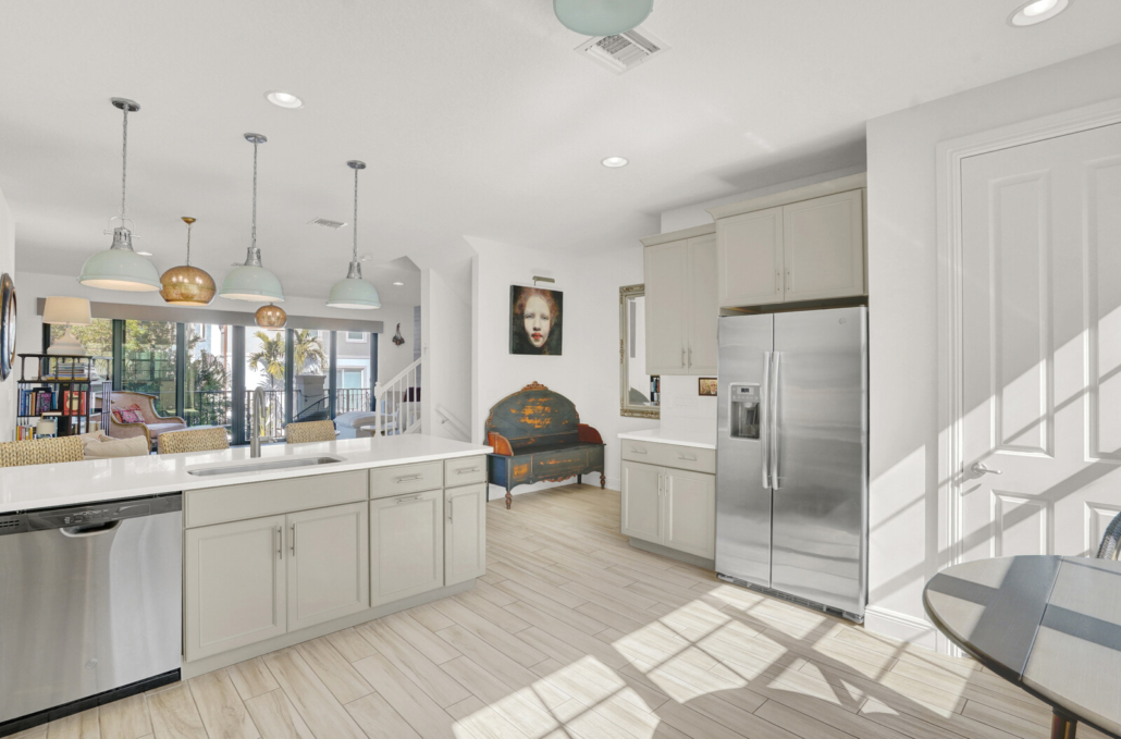 This beautifully designed townhome offers more than 2,400 square feet under air and a total of 3,294 square feet of thoughtfully crafted living space, blending modern comfort with elevated coastal style. Upon entering, you’re welcomed by a versatile flex space that functions perfectly as a home office, fitness room, or additional living area. Wood-look tile flooring, custom window treatments, a convenient half bath, and a fenced private patio enhance both style and practicality.
