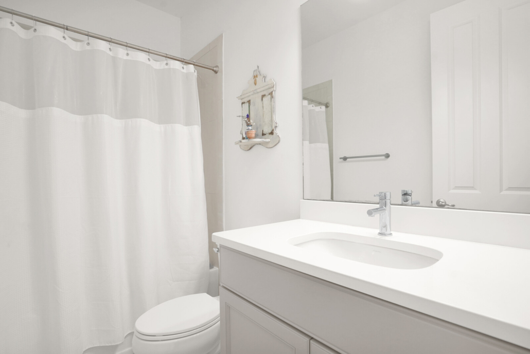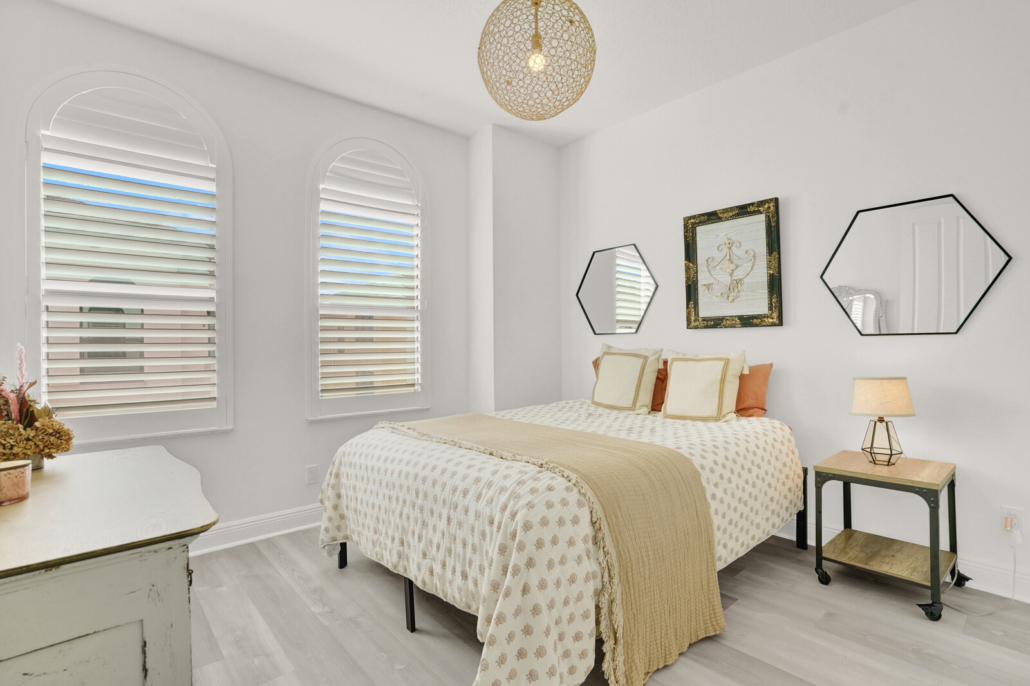 The upper level is finished with luxury vinyl plank flooring throughout the stairs, landing, and all bedrooms. The primary suite impresses with volume and tray ceilings, abundant sunlight, a decorative feature wall, custom-built closet system, and its own private balcony. The spa-inspired primary bath offers dual sinks and an oversized shower with a rain-style showerhead. Two secondary bedrooms sit opposite the primary for enhanced privacy and feature plantation shutters, custom closets, and convenient access to the shared guest bath.