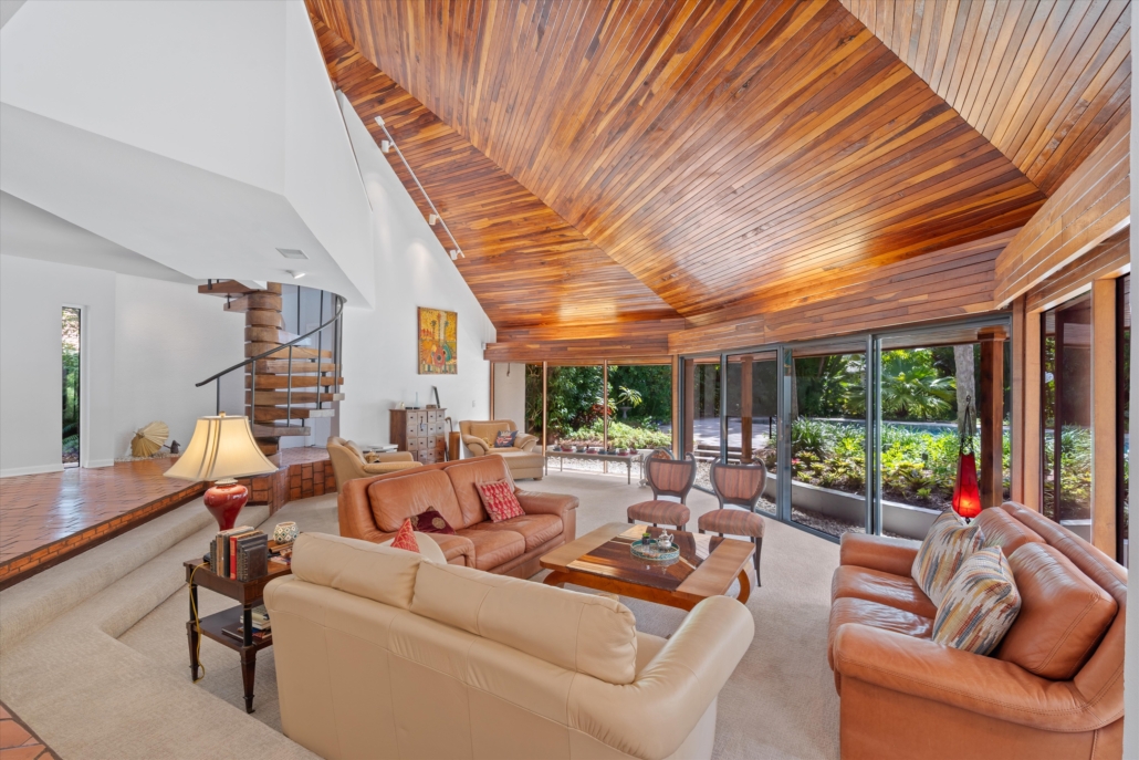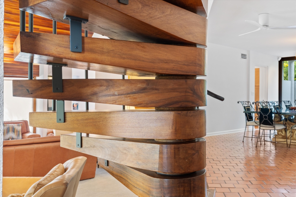 A walk through the front garden brings guests along a path of tropical plantings toward a handcrafted wooden door, or directly to the tranquil Zen pool terrace framed by pavers and a pool accented with fresh mosaic tile. Inside, the great room immediately captivates with a dramatic soaring ceiling and staircase, both crafted from rich Costa Rican Mahogany, setting the tone for an interior defined by organic beauty, natural light, and seamless indoor-outdoor flow. Walls of glass and reinforced sliders open to private courtyards and gardens on all sides, allowing every room to connect with the serene landscape.