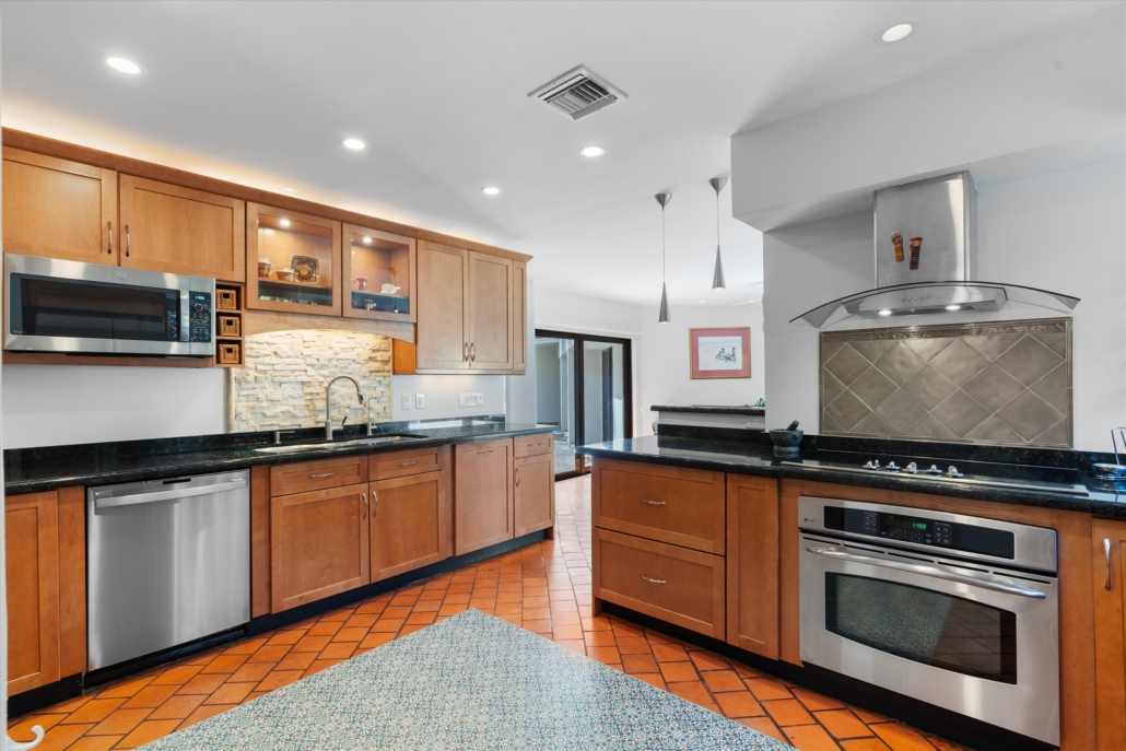 Designed for both intimate living and effortless entertaining, the home provides dedicated private spaces on each level. The family room offers relaxed dining and direct access to the kitchen, the pool terrace, and the barbeque courtyard. A well-appointed kitchen sits at the heart of the home, featuring granite countertops, a stone backsplash, GE Profile appliances, and soft-close cabinetry.
